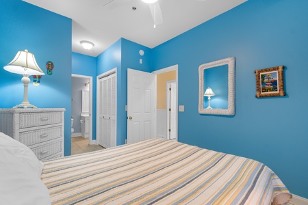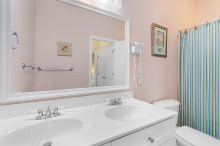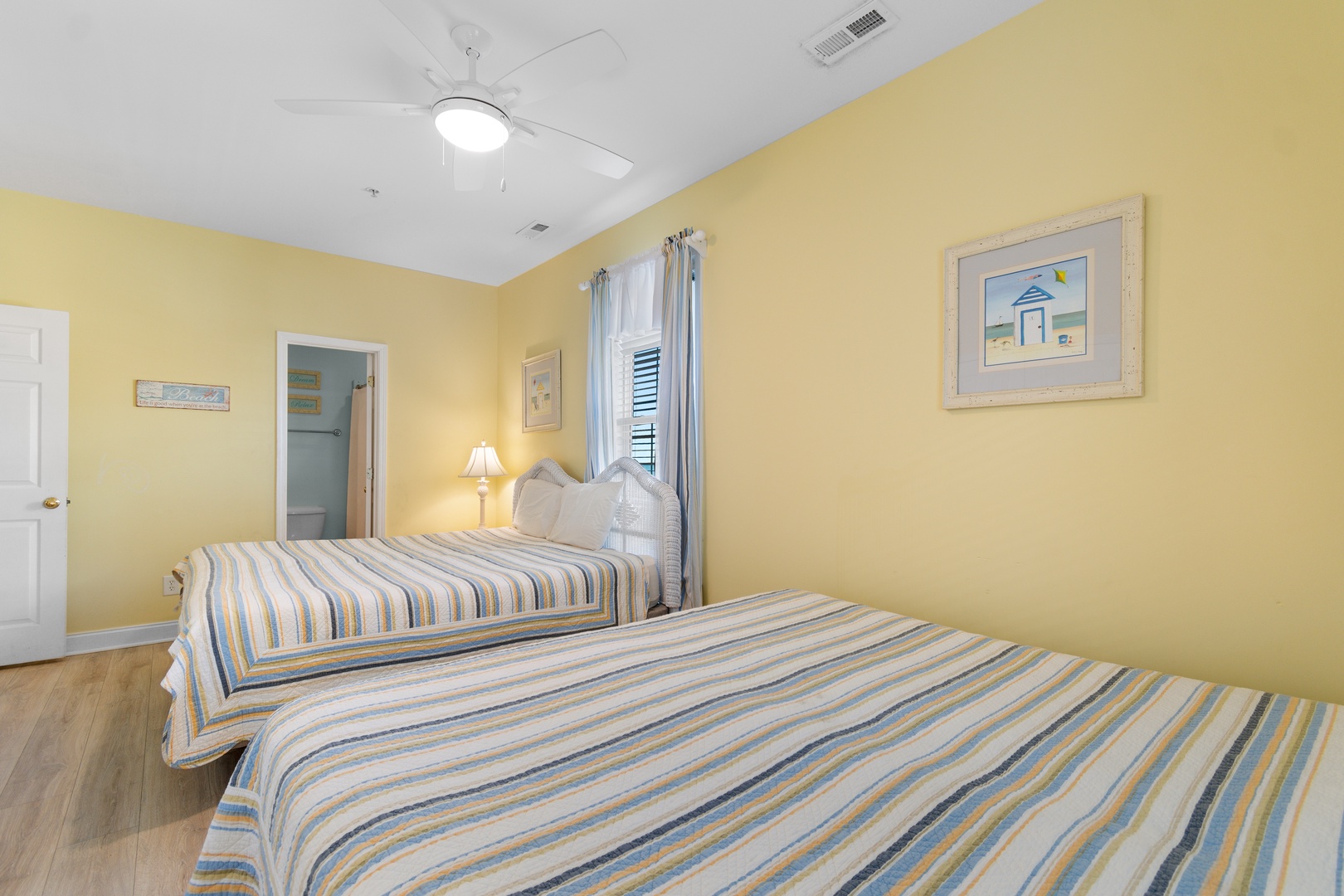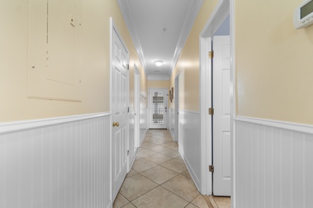 Each of the six bedrooms features a distinct design with calming pastel hues that promote rest and relaxation. The spacious layout ensures everyone has plenty of room to unwind, while the bathrooms are well-appointed with fresh towels and essential toiletries.