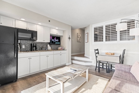 The fully equipped kitchen features modern appliances, cookware, and utensils, making meal prep a breeze. The dining area comfortably seats four or more guests, perfect for shared meals, while the additional breakfast bar provides casual dining space.
