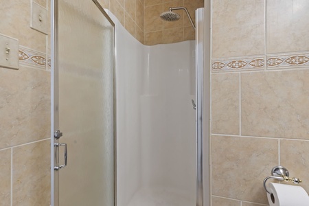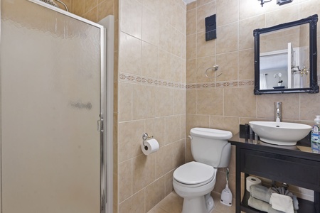 Bedroom 1: This spacious bedroom offers a queen-size bed, cozy linens, a flat-screen TV, and an en-suite bathroom with a walk-in shower.​