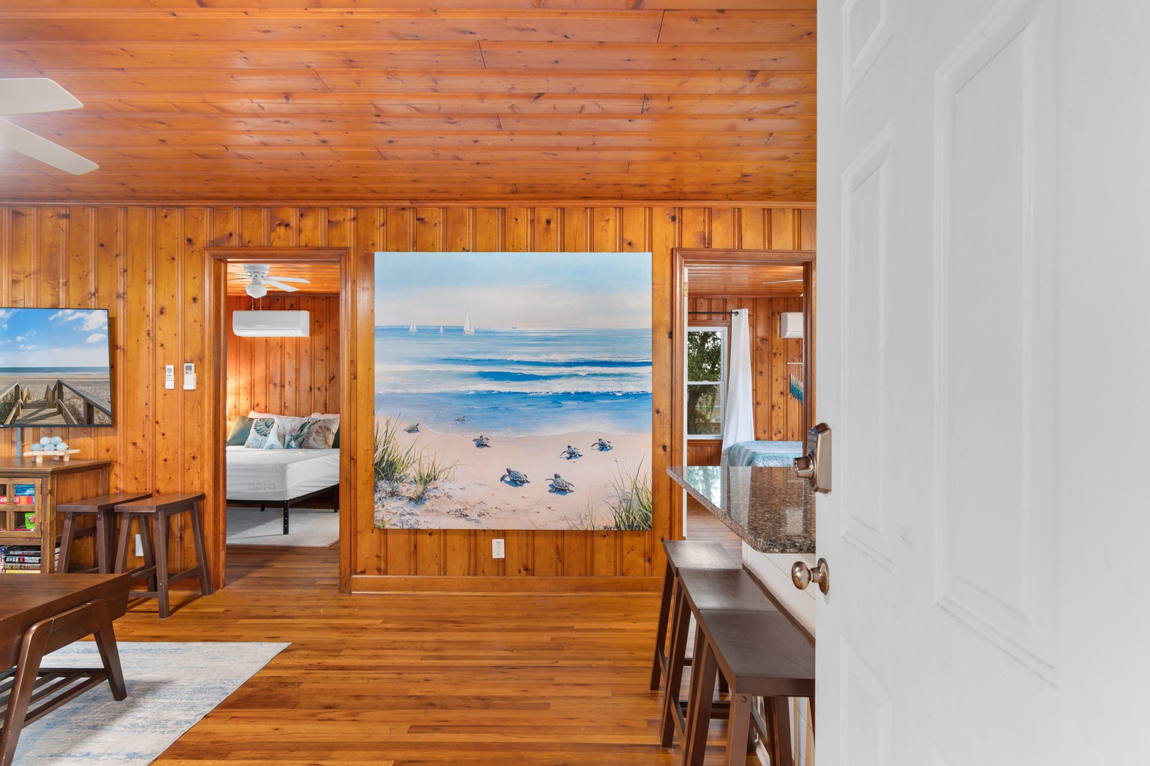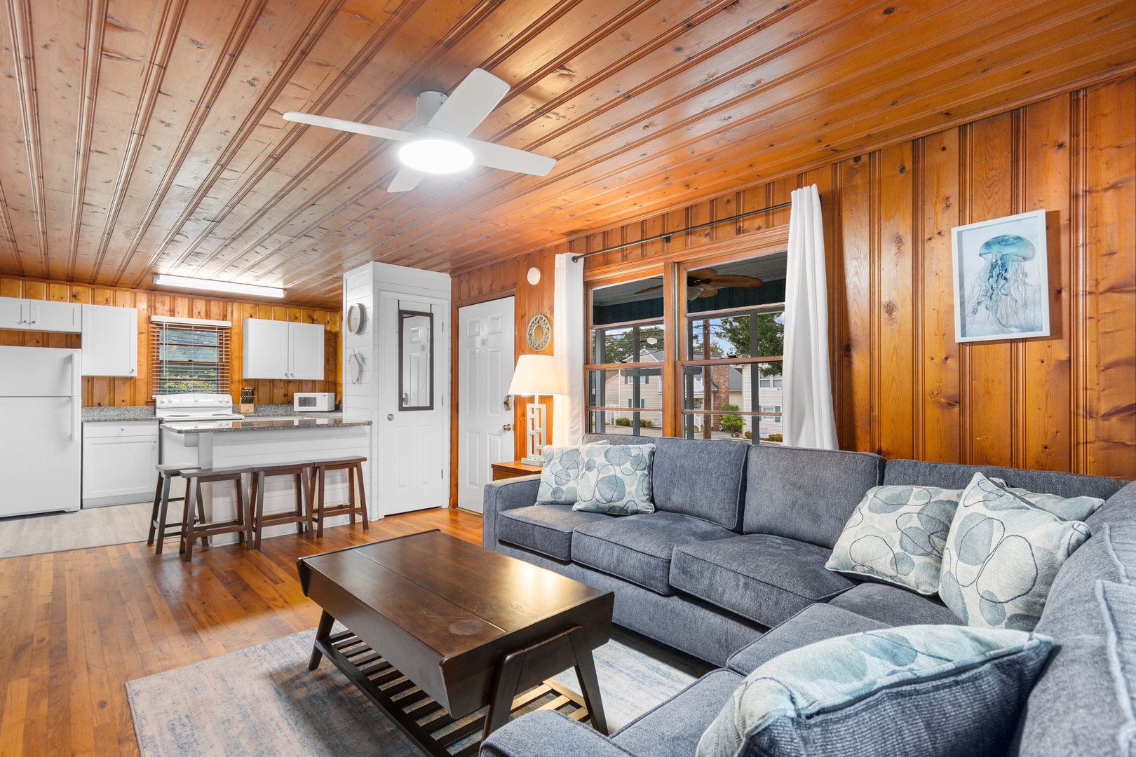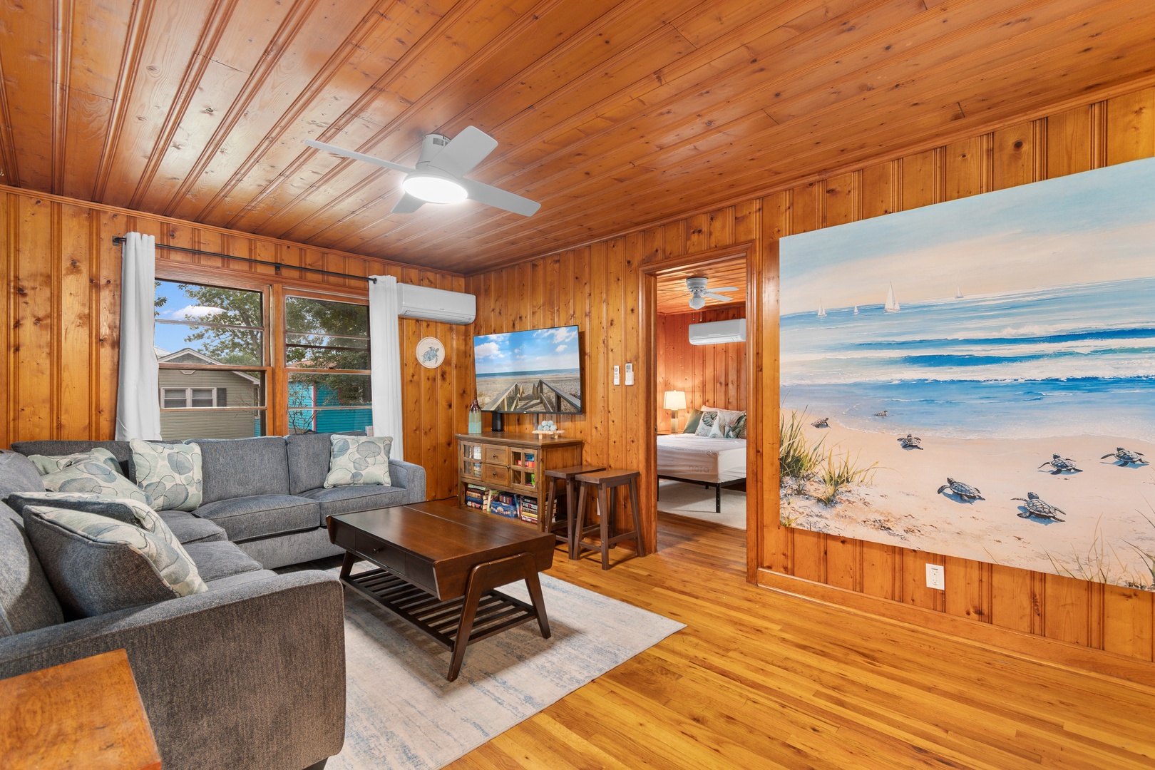 Inside, you’ll find a spacious living room ideal for gathering and movie nights, along with a shared full bathroom conveniently accessible from both bedrooms. The home comfortably sleeps up to 6 guests, offering a restful space after sunny days on the coast.
