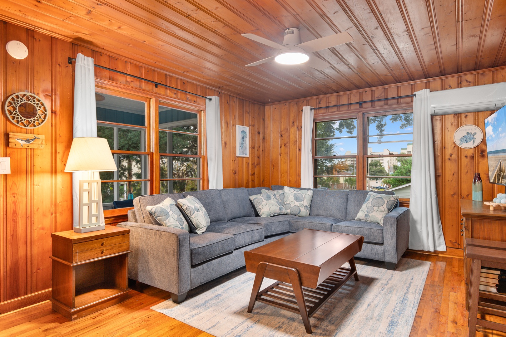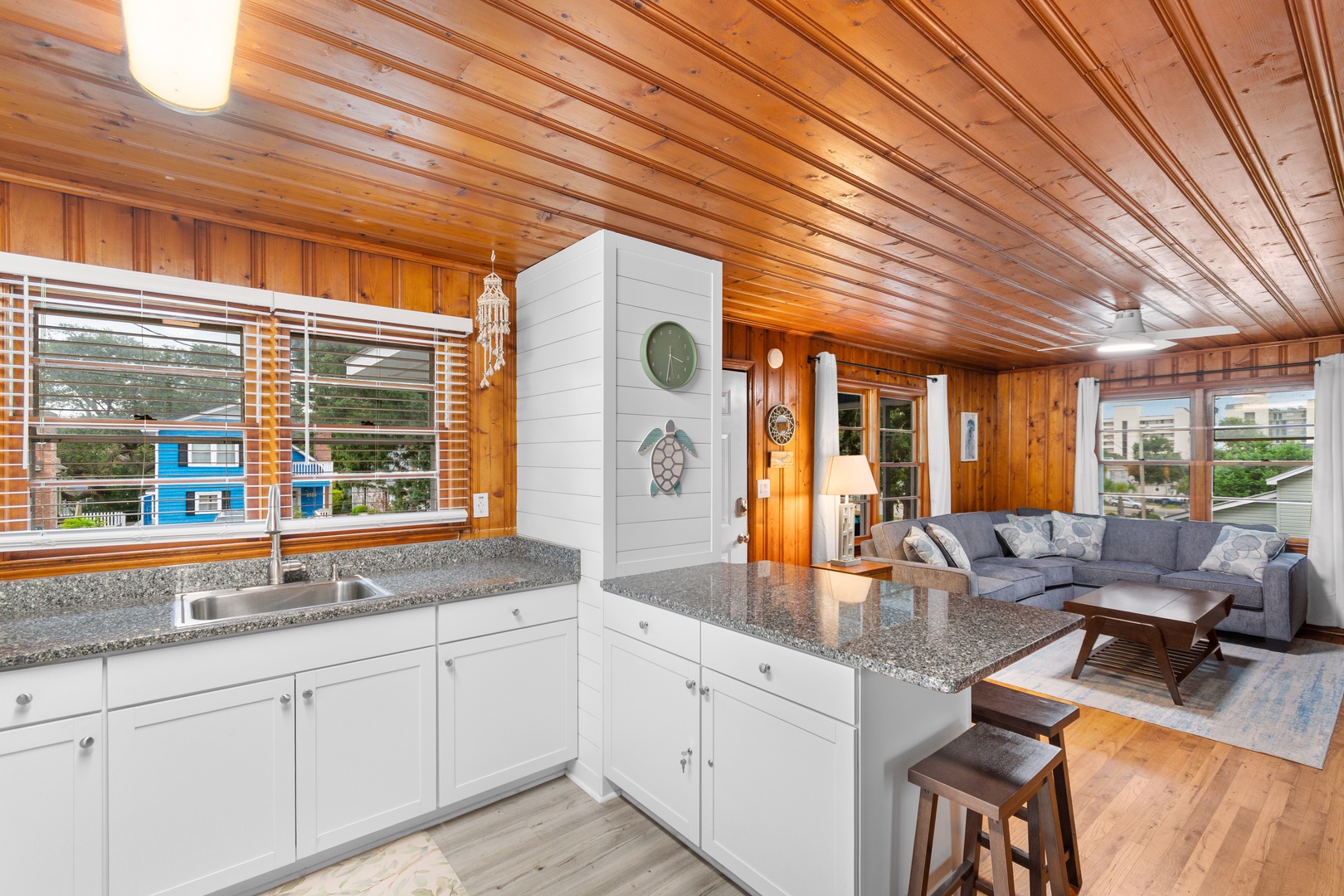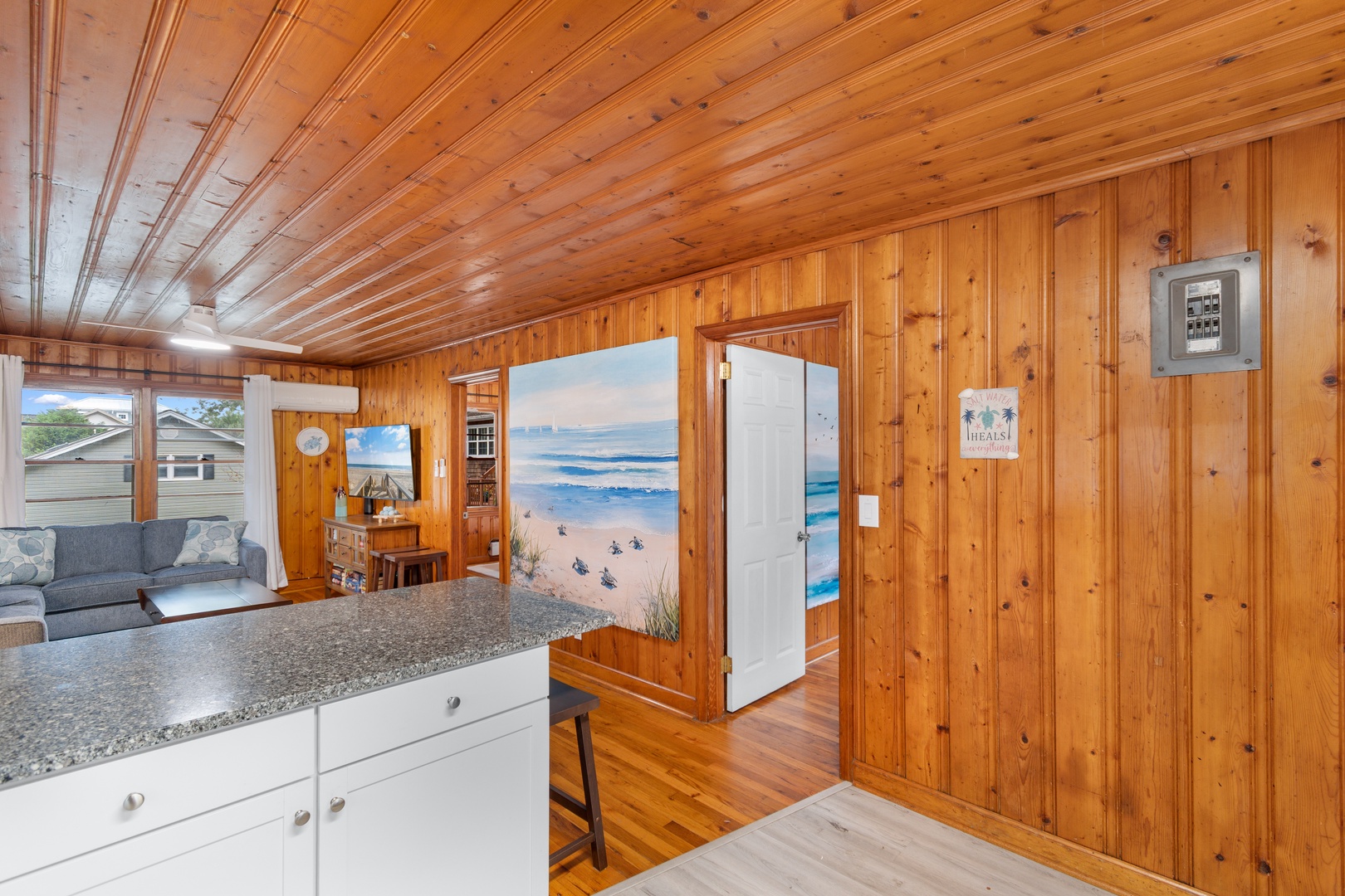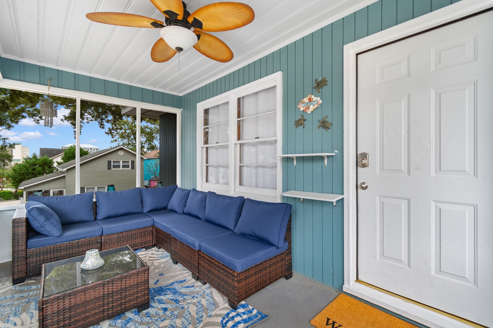 Inside, you’ll find a spacious living room ideal for gathering and movie nights, along with a shared full bathroom conveniently accessible from both bedrooms. The home comfortably sleeps up to 6 guests, offering a restful space after sunny days on the coast.