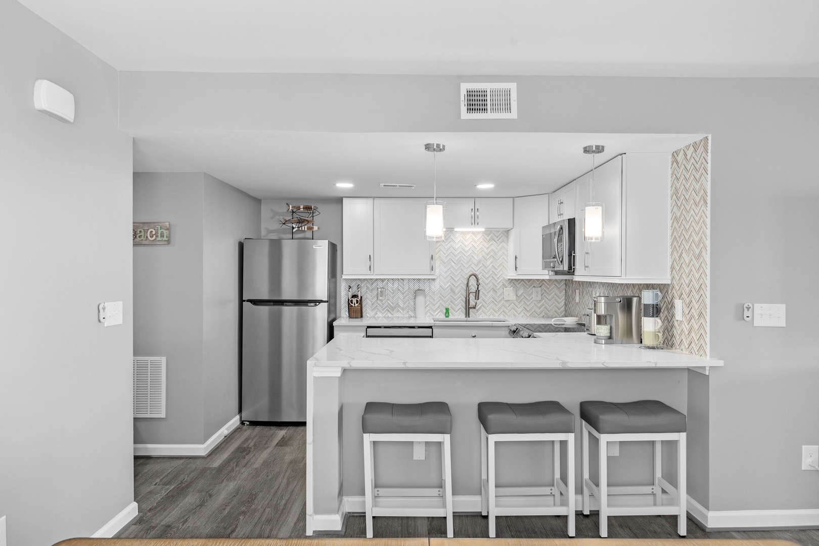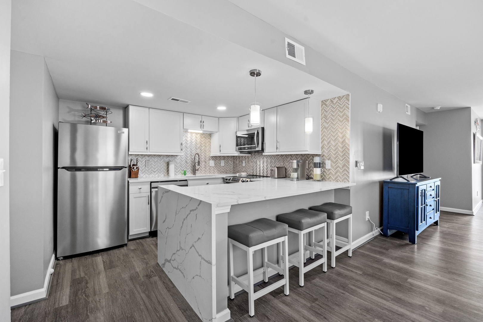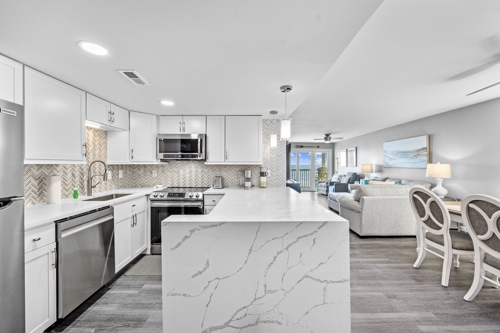 Relax with a view of the Ocean from each of the Bedrooms, equipped with the coziest of beds. Our stylish kitchen is ready for any culinary adventure. A large Smart TV awaits in the entertaining Living Room.
