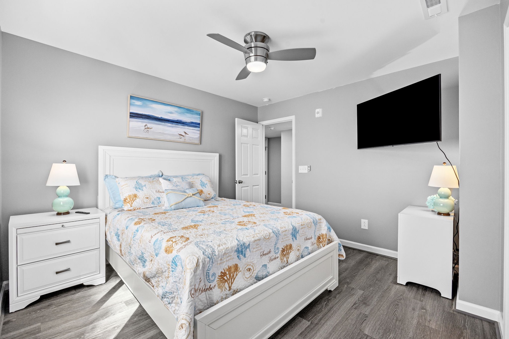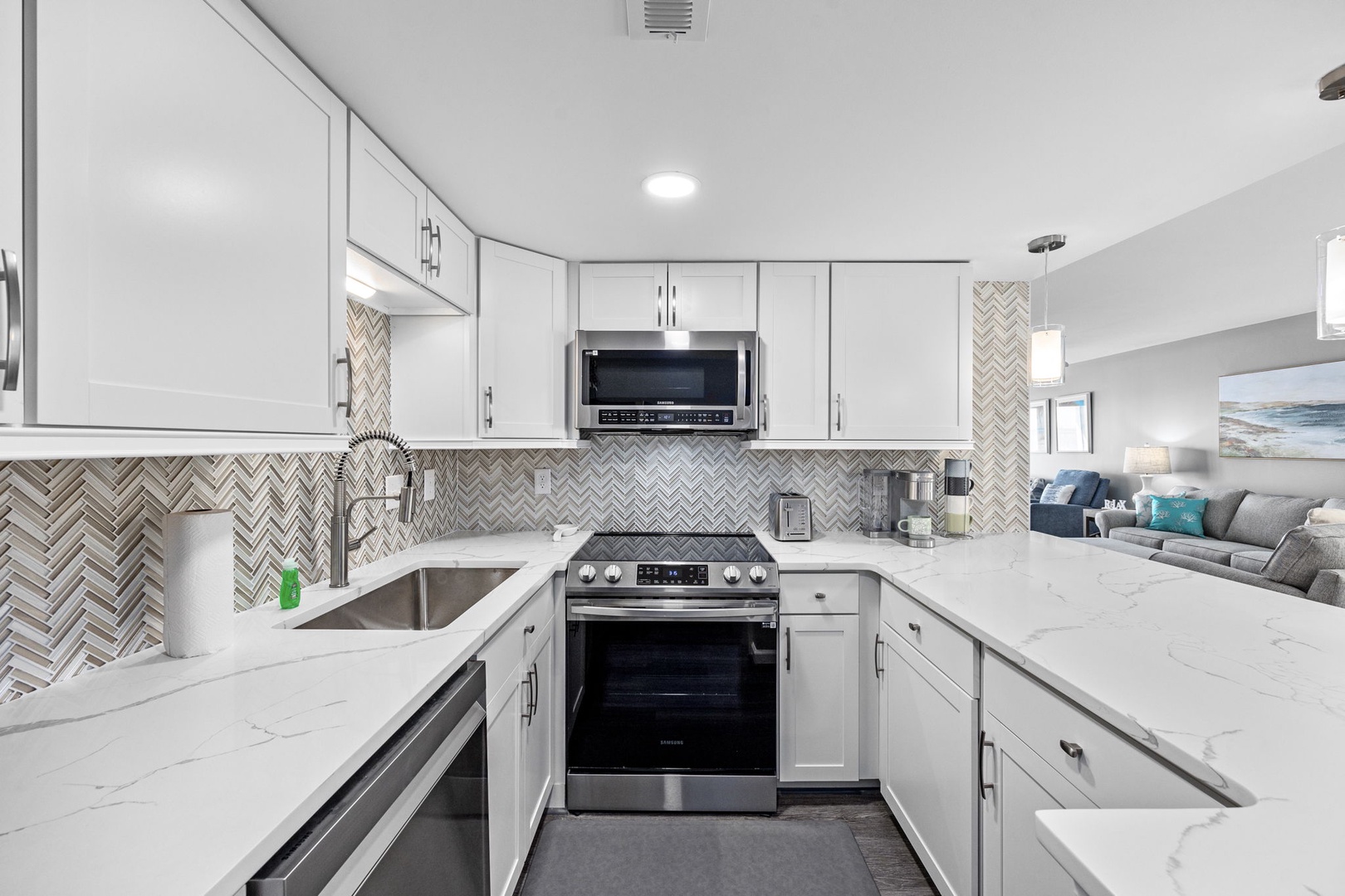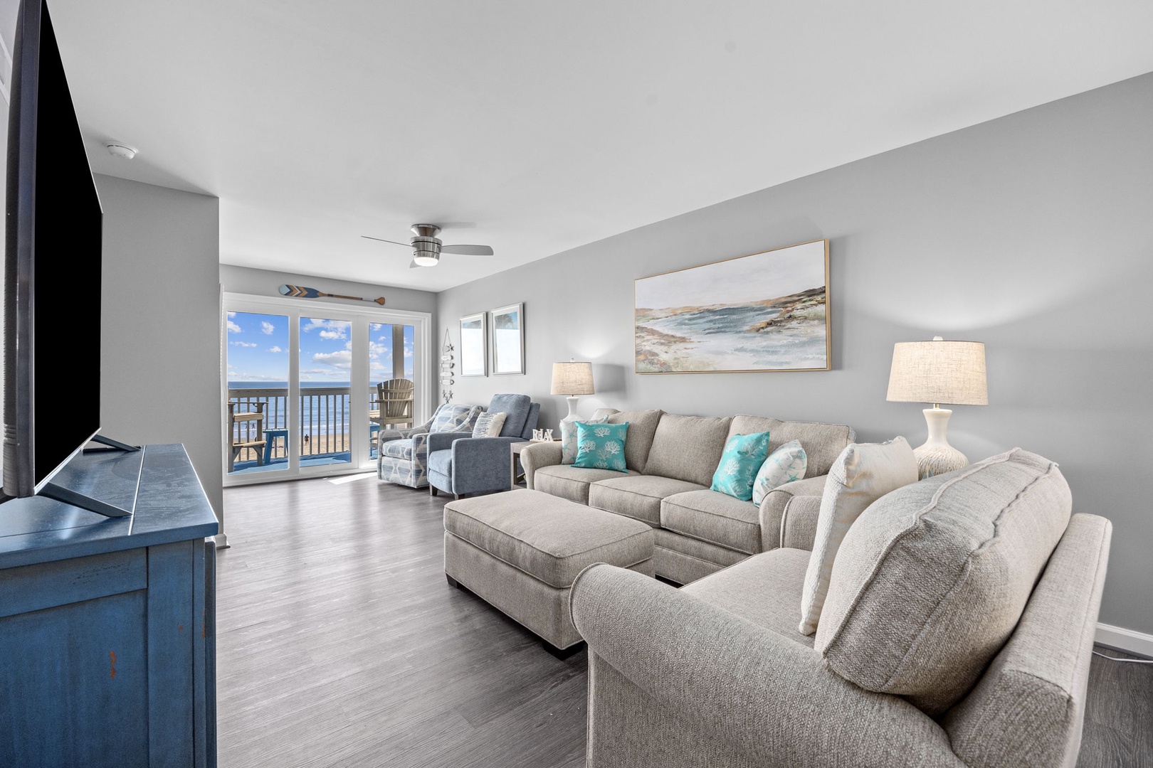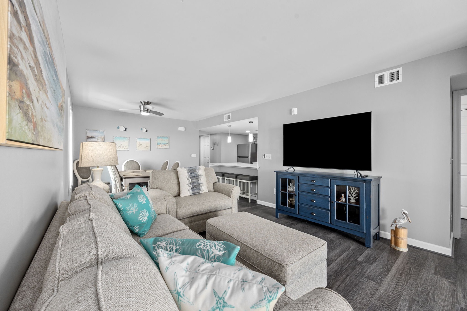 Relax with a view of the Ocean from each of the Bedrooms, equipped with the coziest of beds. Our stylish kitchen is ready for any culinary adventure. A large Smart TV awaits in the entertaining Living Room.