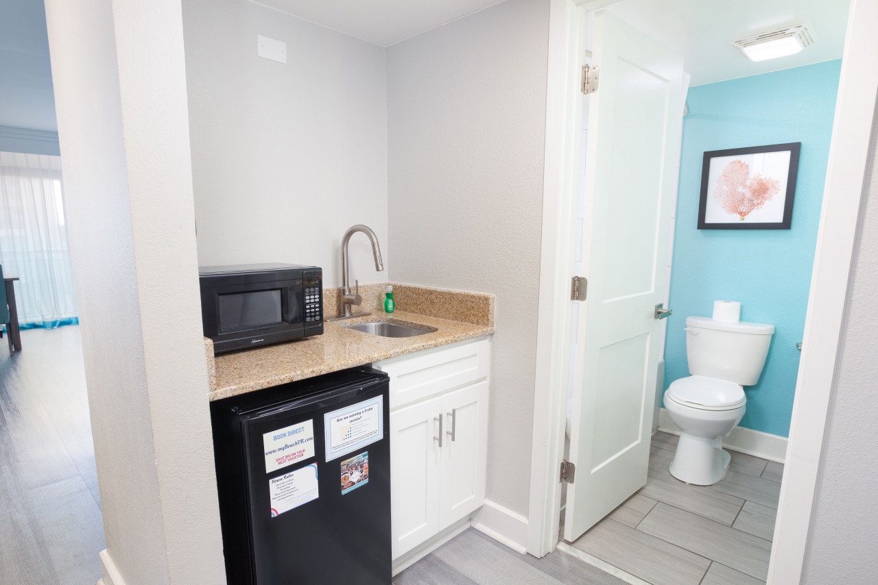 Prepare light meals with ease in the fully equipped kitchenette. Ideal for snacks, quick breakfasts, or simple dinners before heading out to explore the Myrtle Beach food scene.