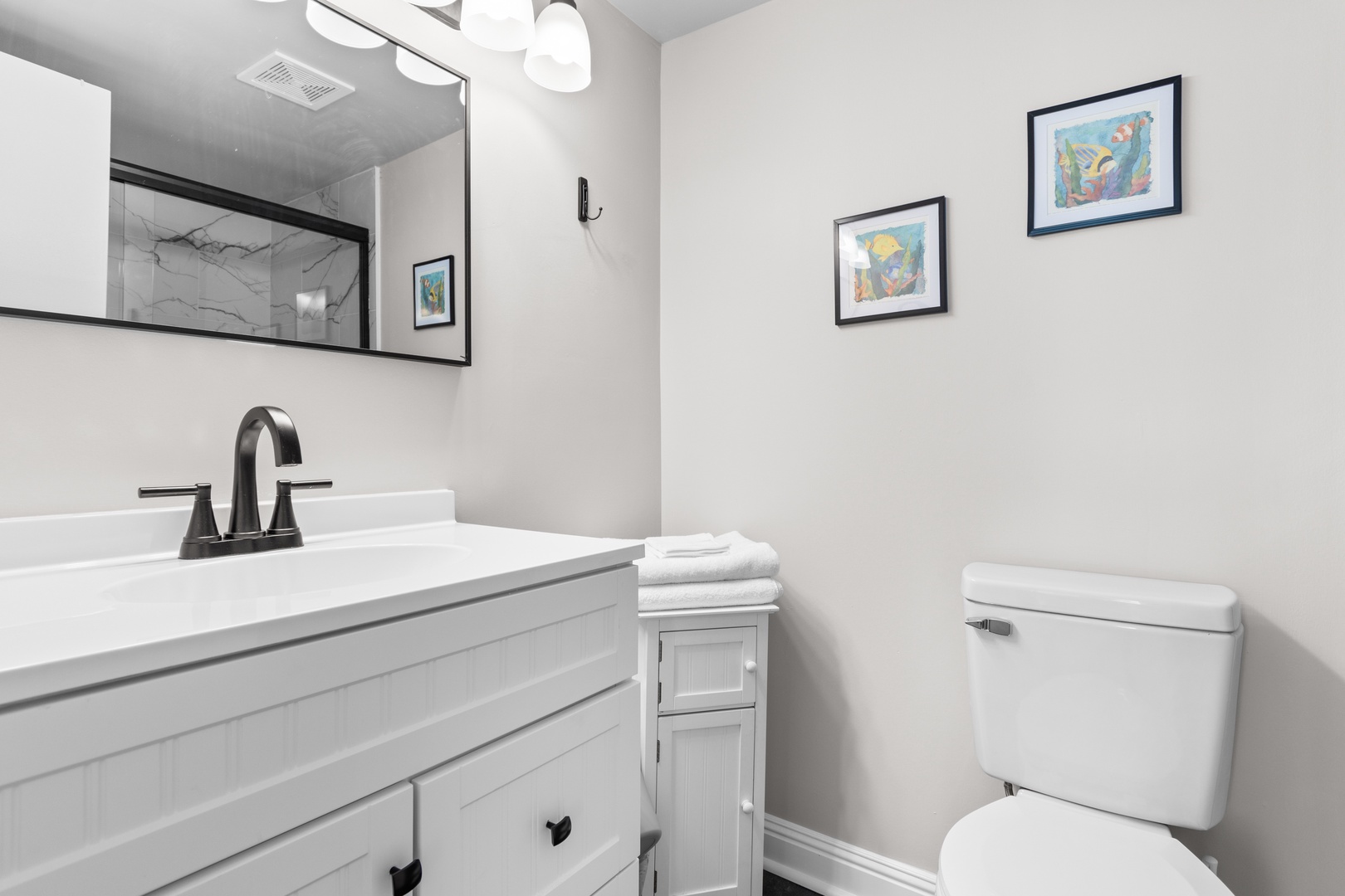 Both bedrooms are thoughtfully furnished, ensuring a restful and peaceful stay. The bathrooms are stocked with all necessary essentials for your convenience.