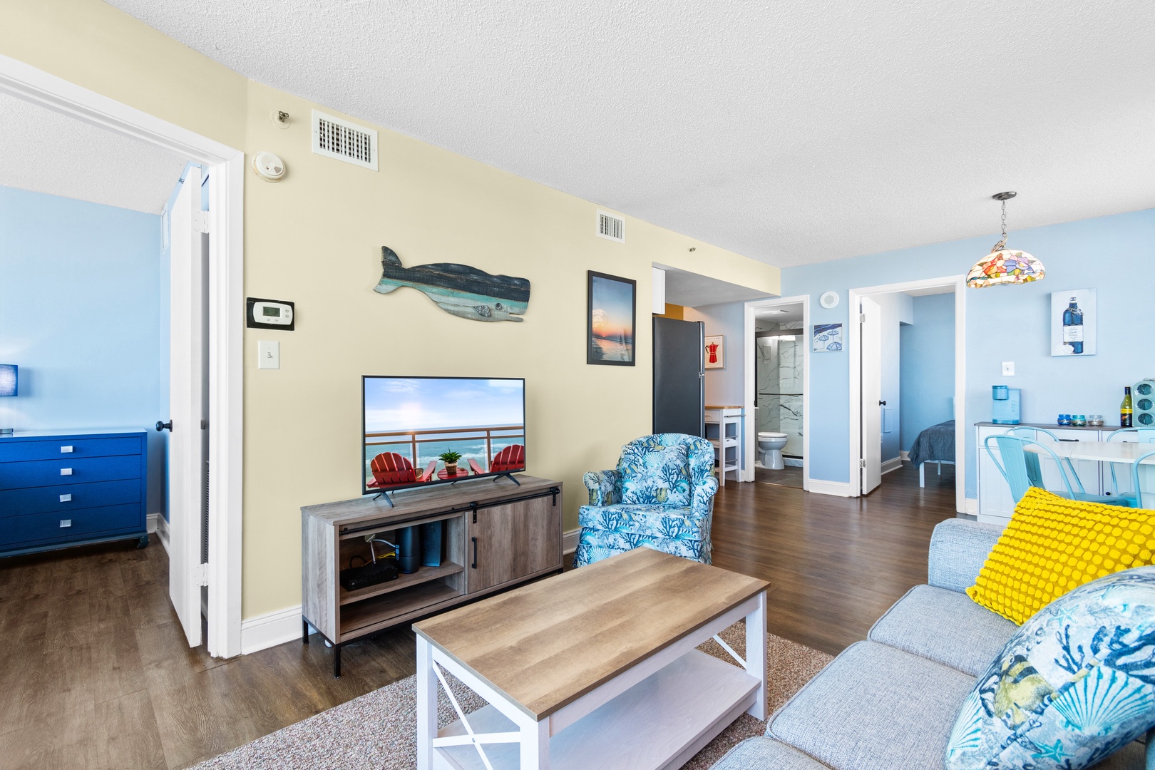 The living room provides cozy, comfortable seating, ideal for relaxation and unwinding. The couch is also a queen sofa bed.