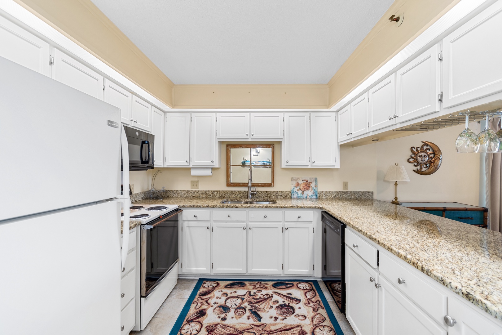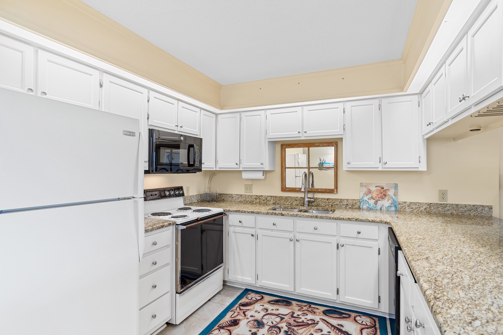 Modern Amenities: Enjoy the convenience of a fully-equipped kitchen with a Frigidaire refrigerator, Whirlpool stove and oven, GE dishwasher, and a Keurig coffee machine. A Maytag stackable laundry machine is also available for your use.