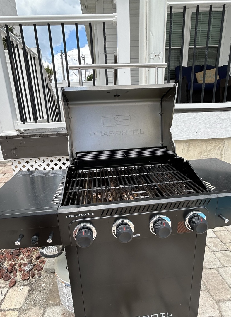 * A gas grill is in the backyard.