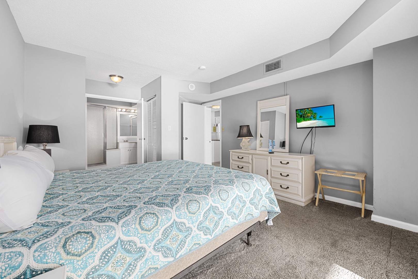 ☆ Primary Bedroom features a King Bed, private Bathroom, and direct access to the Balcony