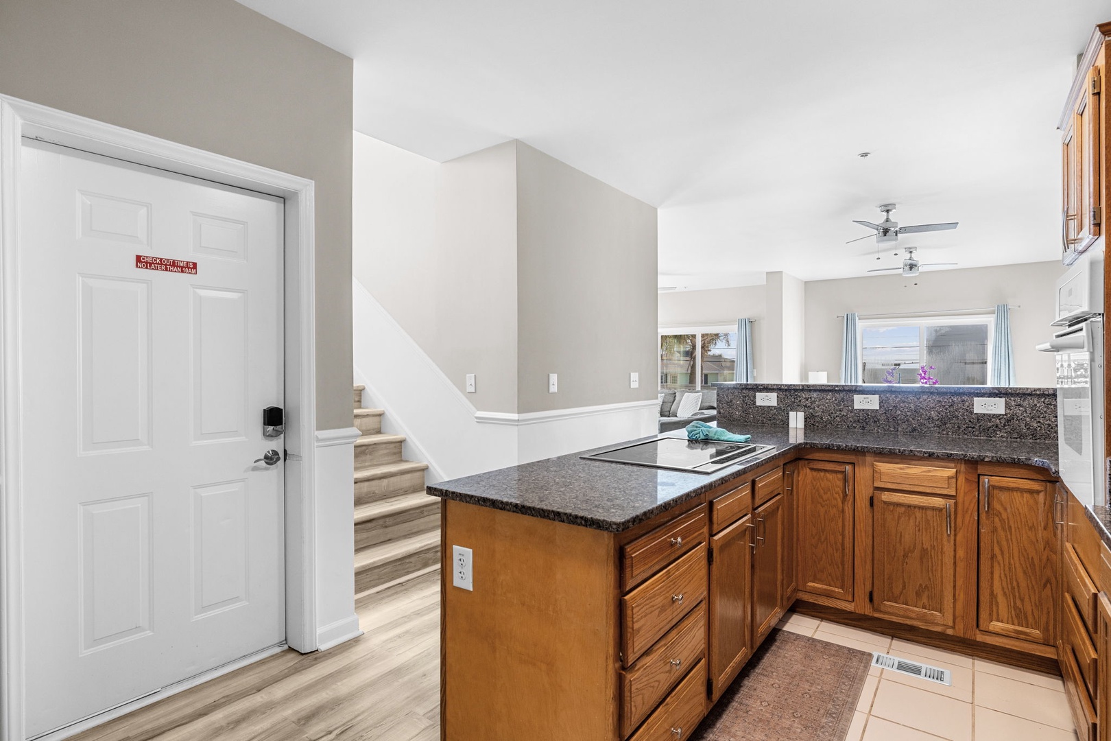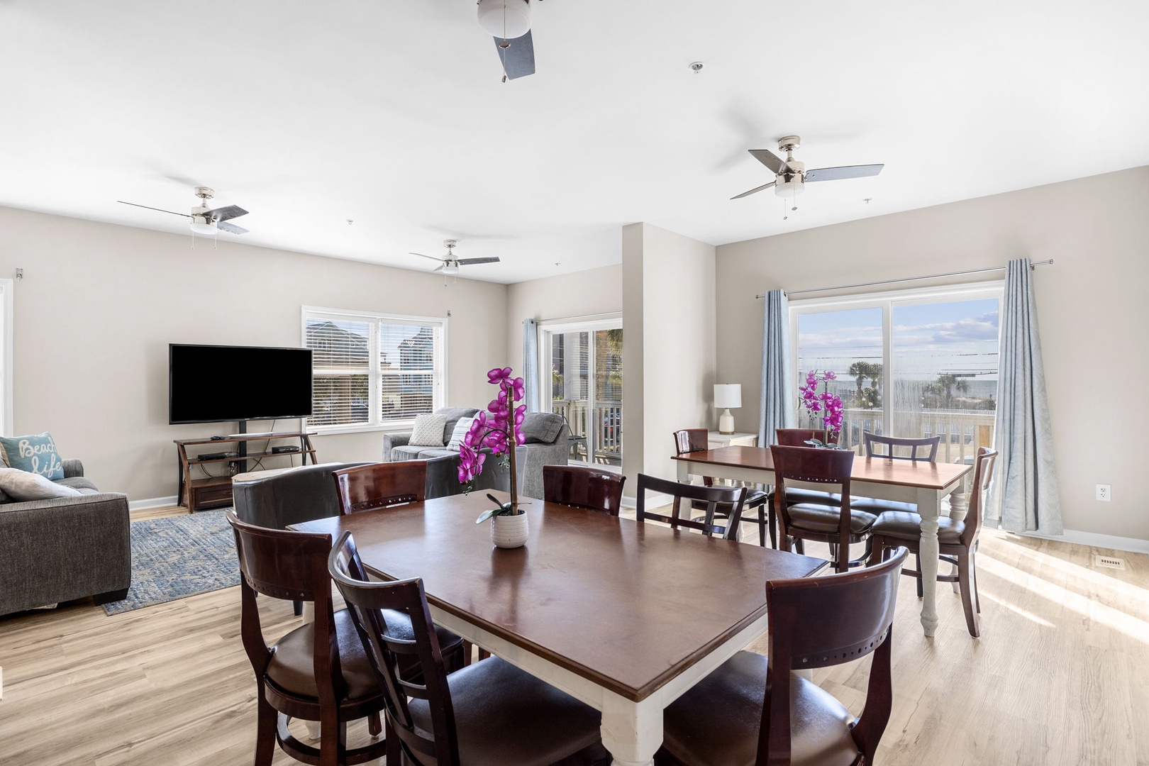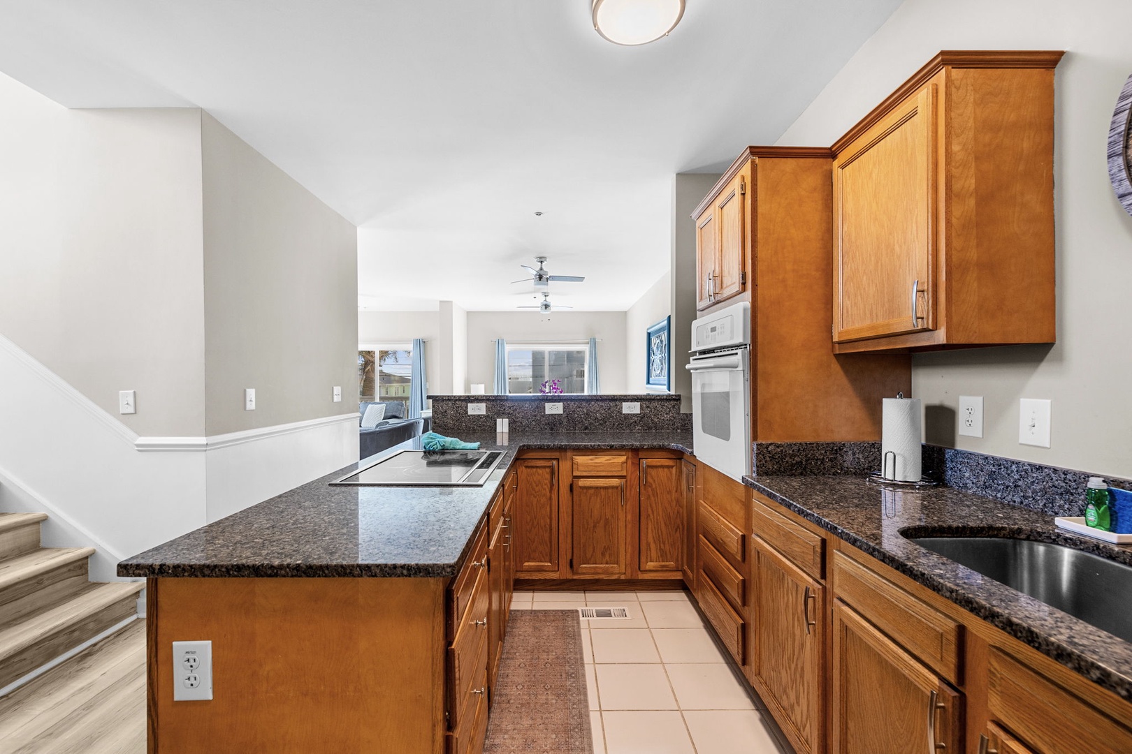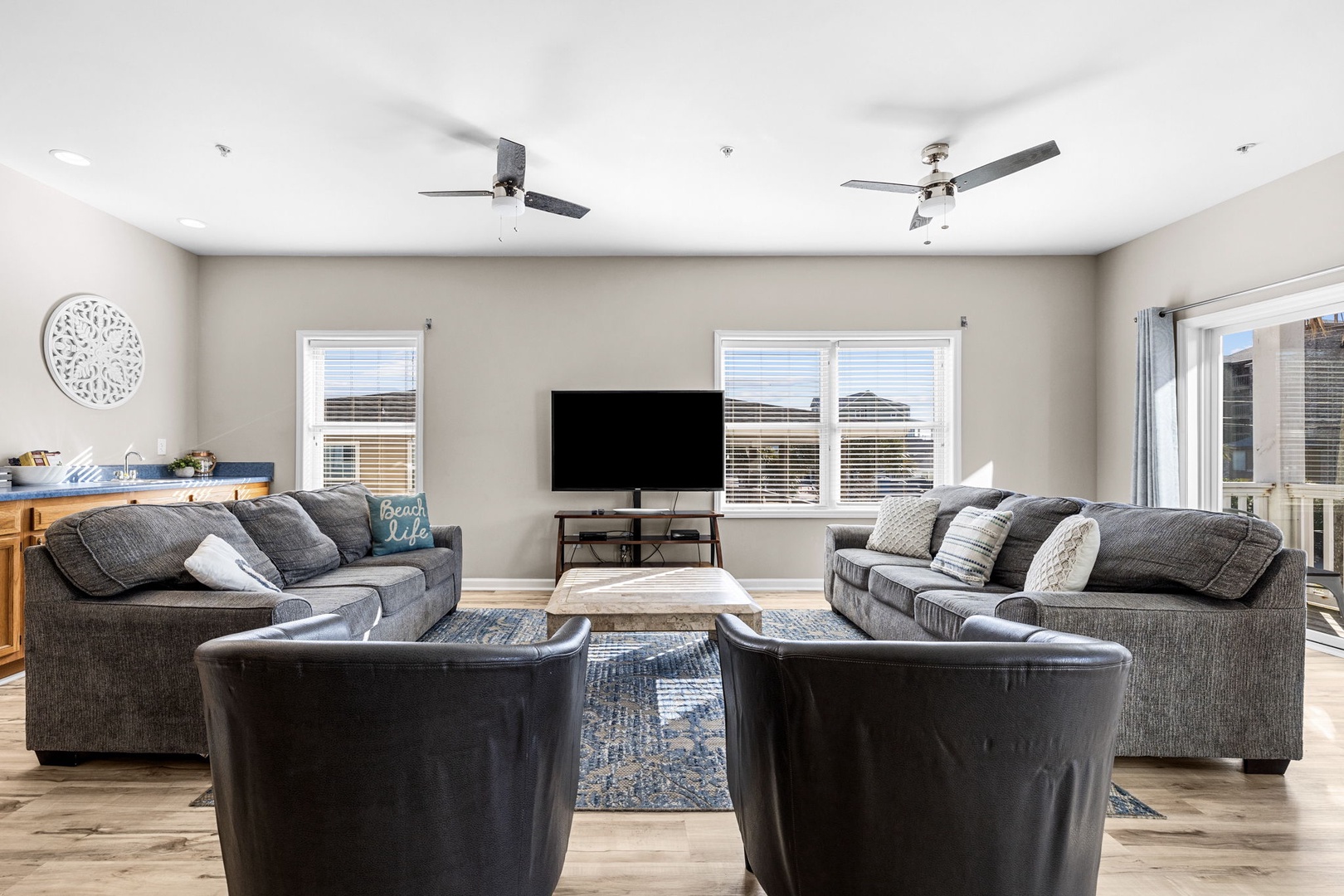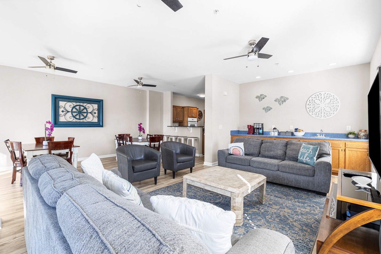 As you walk up the first set of stairs you'll enter the Home and find a large Living Room with Smart TV and Balcony access overlooking the Ocean. With plenty of seating for the entire group, you'll also find a long bar with a Coffee Station and sink.