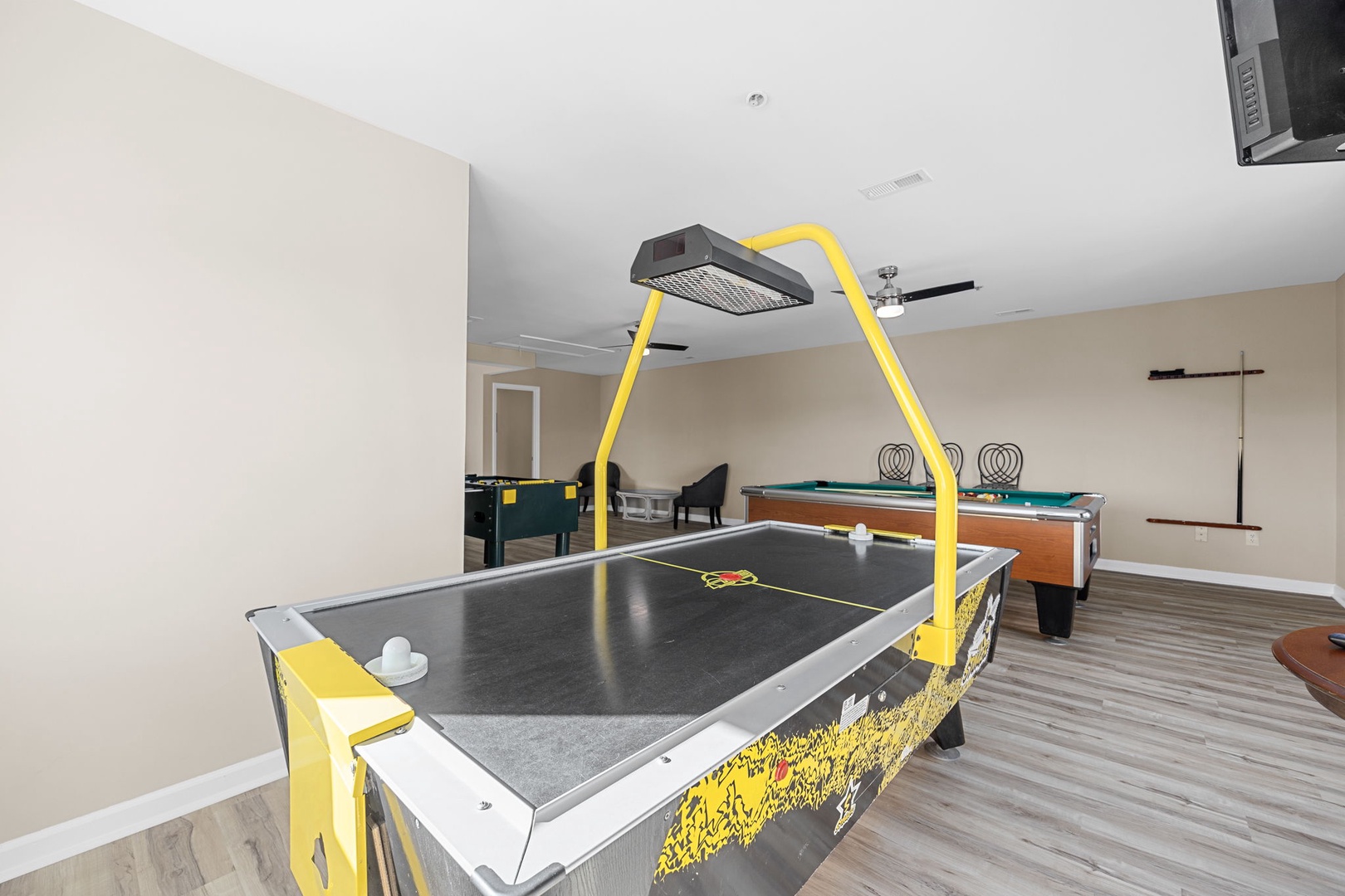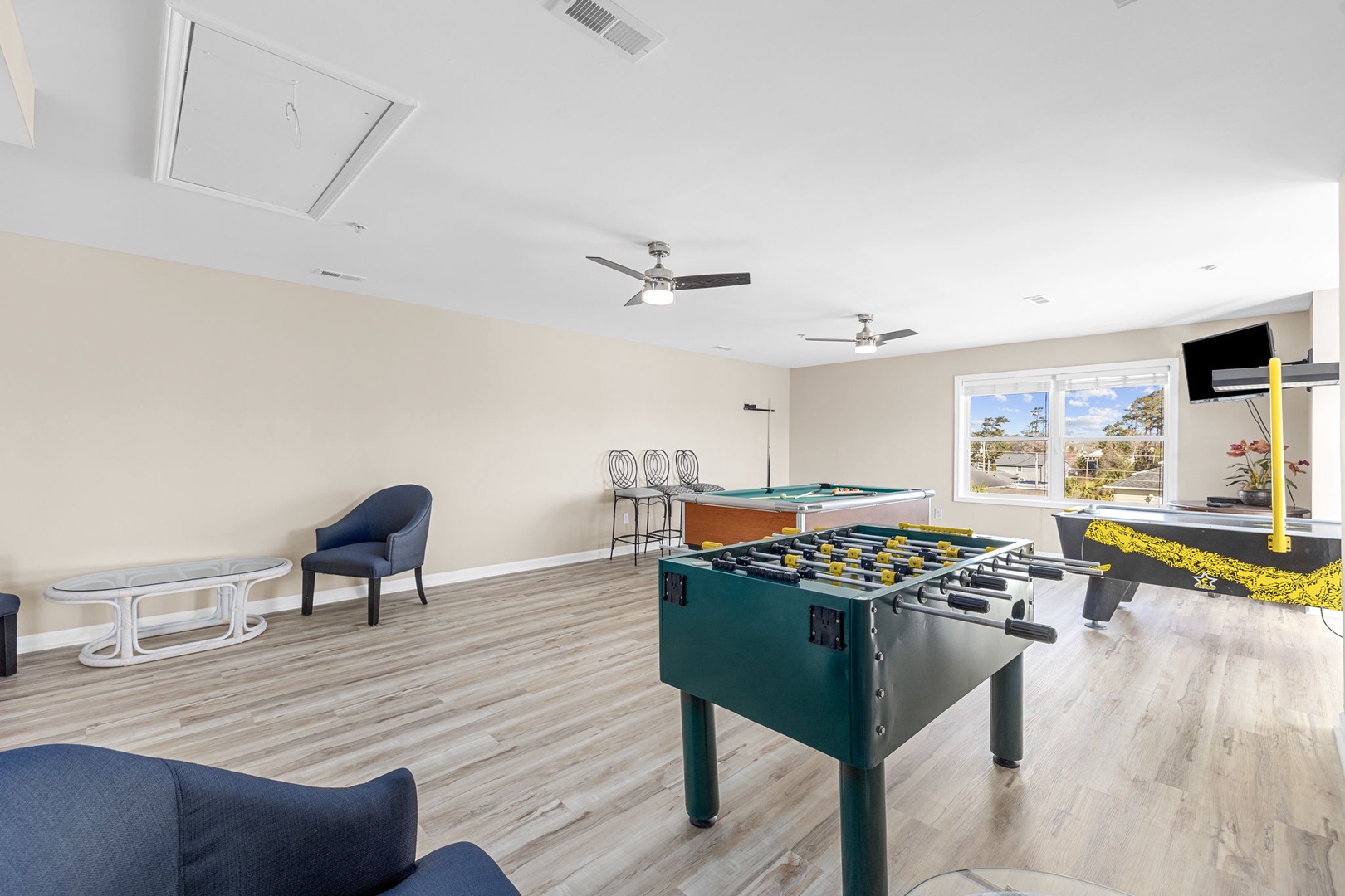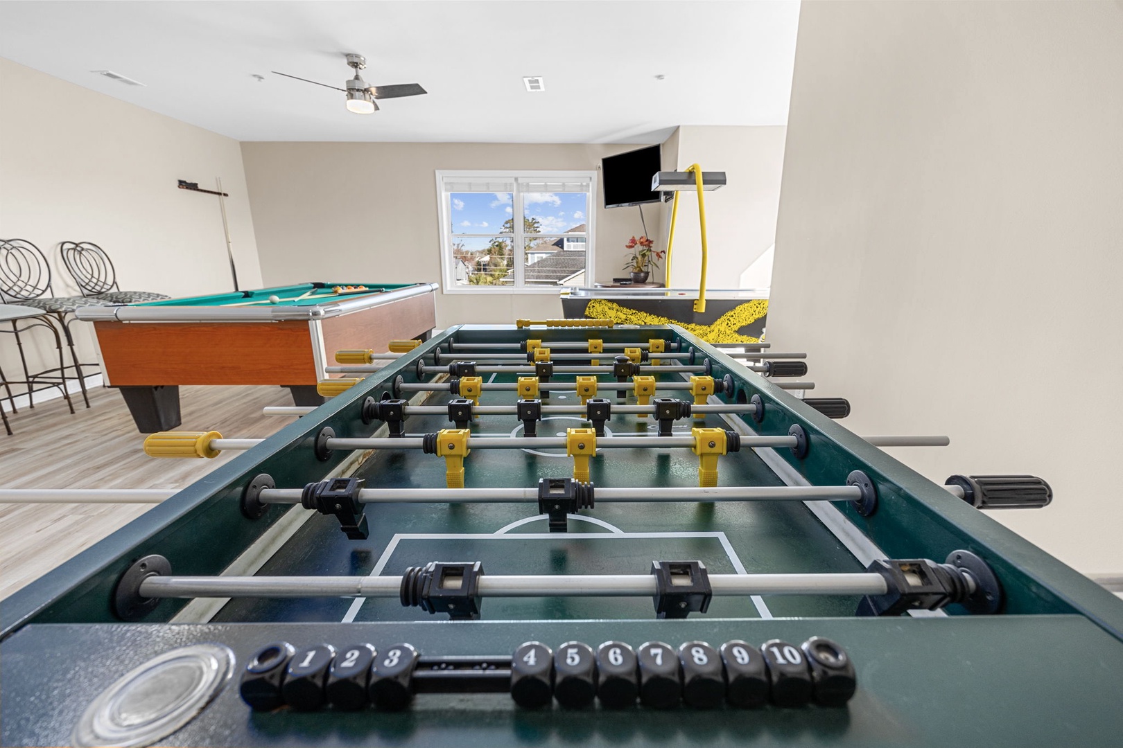 The Gameroom is decked out in a large area on the top floor which includes a Pool table, Air Hockey, and Foosball with a TV.