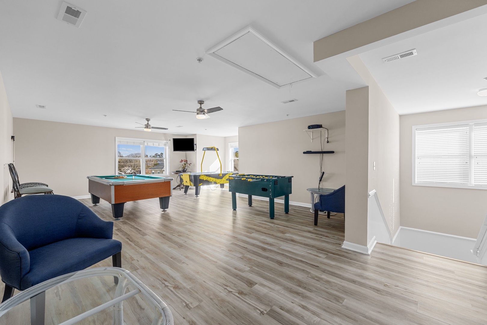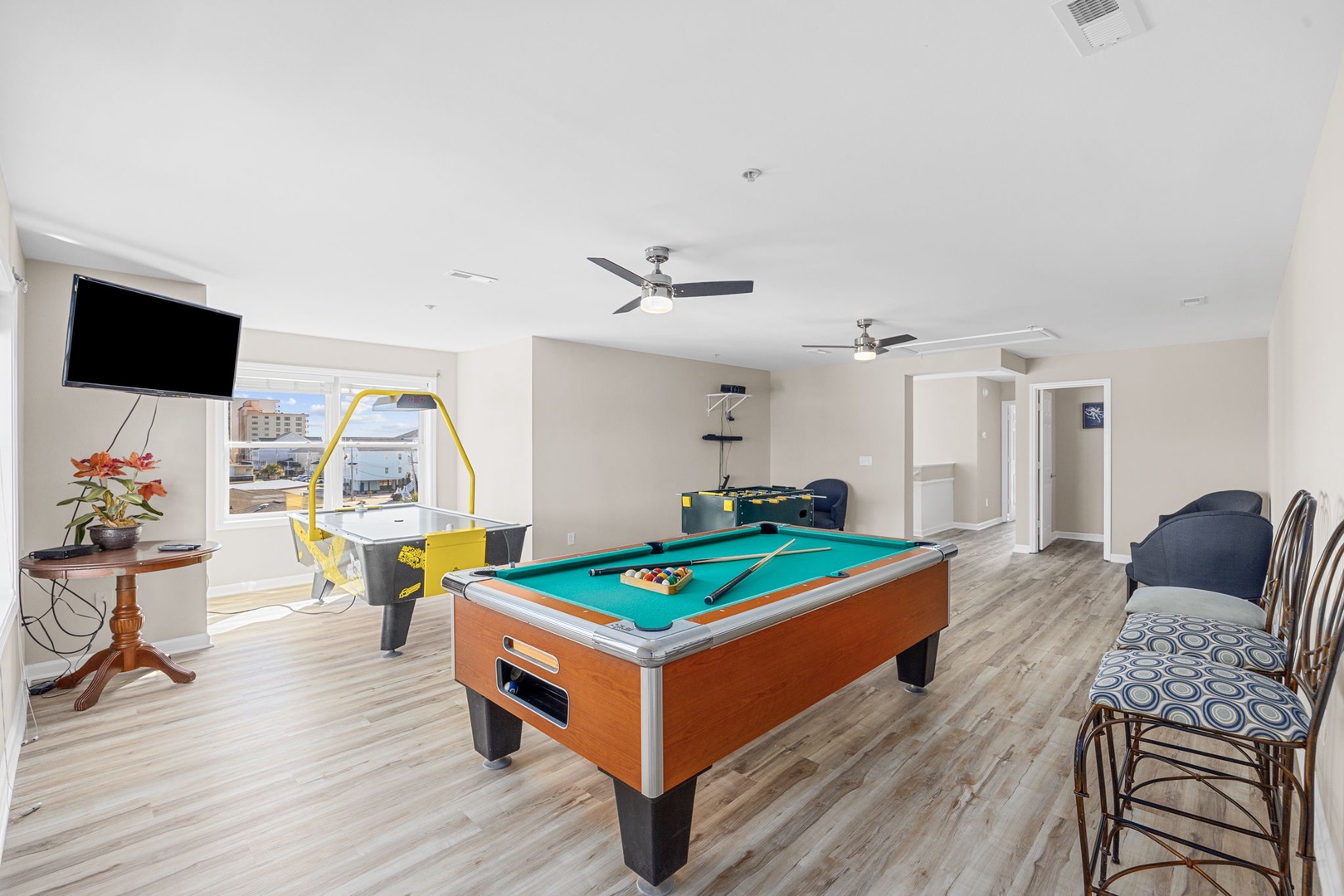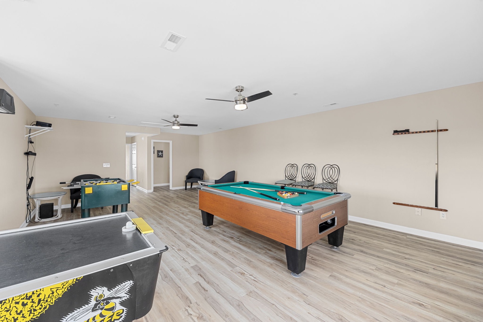 The Gameroom is decked out in a large area on the top floor which includes a Pool table, Air Hockey, and Foosball with a TV.