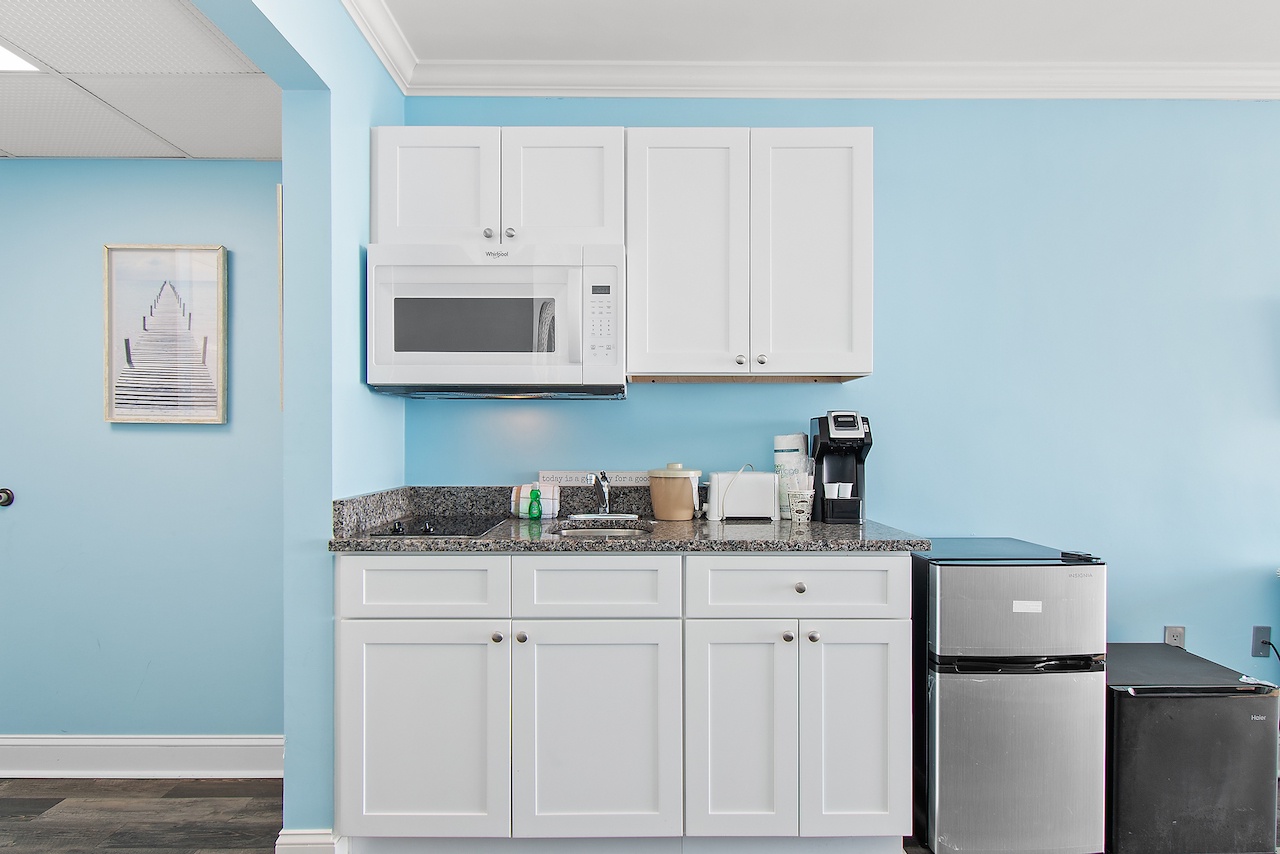 Kitchenette with microwave, mini-fridge, Keurig