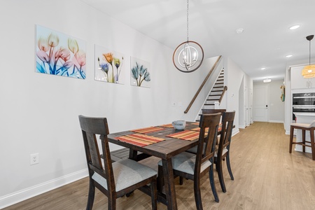 The spacious Living Room seats plenty on the large, sectional couch. There is no shortage of modern furnishings and touches in our Townhome. The Smart TV is set up with Cable and Streaming Services aplenty. Natural light fills the room from the back and leaves a warm, homey feeling.