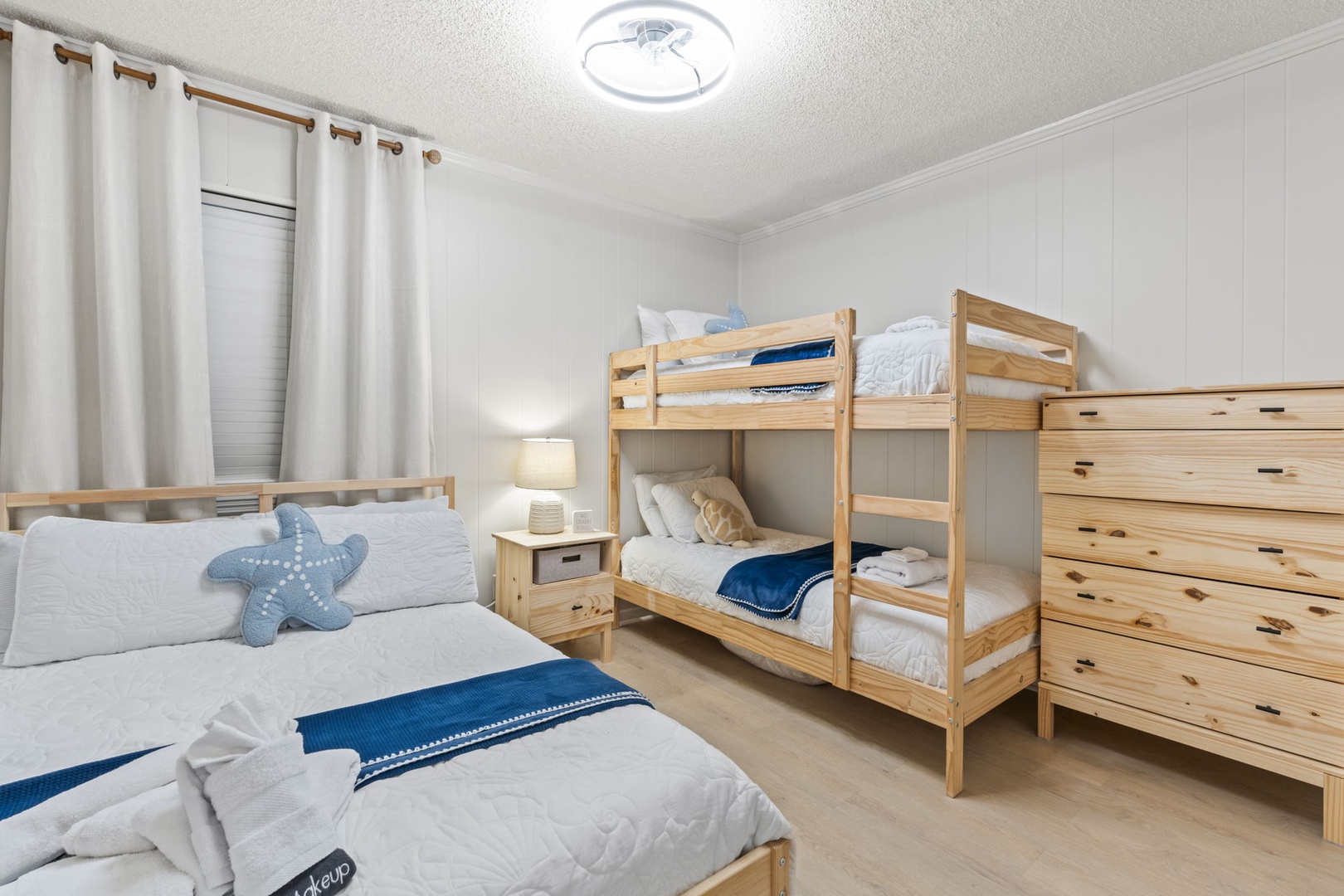 Bedroom 2 – Offers a full-size bed and a twin bunk bed, ample closet space, and access to the second full bathroom featuring a relaxing bathtub.