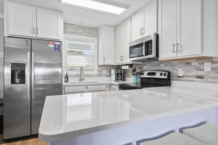 Cook with ease in the fully equipped kitchen, featuring modern appliances, ample counter space, and all the cookware and utensils you’ll need. Share meals together at the dining area or enjoy snacks poolside.