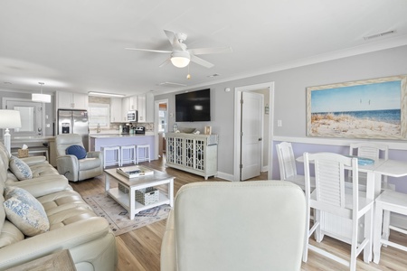 Step into a welcoming living space that blends comfort with convenience. The open layout features cozy seating, a flat-screen TV, and direct access to the covered deck overlooking the private pool. It’s the perfect spot to gather, relax, and keep an eye on the kids while they swim.